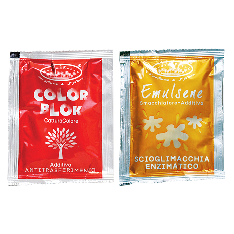 • COLOR BLOK – Unidose 50mlAdditif contre la ré-déposition de la couleur. • EMULSENE – Unidose 50mlAdditif dégraissant et émulsifiant avec une action détachante enzymatique. |