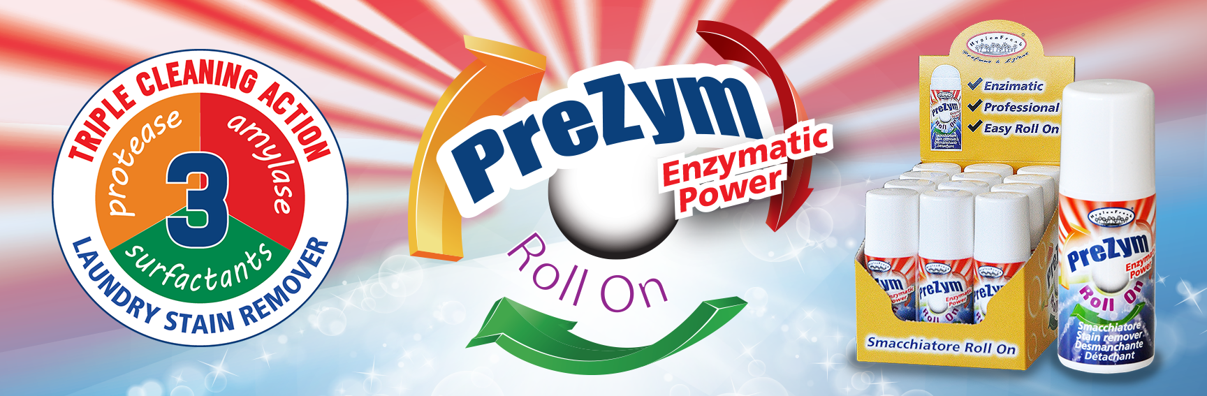 La formule bi-enzymatique concentrée de PreZym roll on, outre les tensioactifs dégraissants, lui confère un spectre d'action très ample. Il sera ton atout, un seul produit pour tous les types de taches. La spéciale formule étudiée par notre section de recherche et développement amène la science au service de l'activité quotidienne. L'enzyme protéase enlève la saleté de nature protéique, donc il est actif sur sang, chocolat, sauces, œufs, lait, glace, etc. L'amylase enlève la saleté contenant amidon (par exemple les taches de riz, nourriture pour bébés, herbe, pommes de terre, etc.) Les enzymes sont macromolécules complexes, composées principalement de protéines. Leur particularité est le fait de catalyser (c'est-à-dire d'accélérer) une réaction de dégradation. Il suffit de les activer en ajoutant de l'eau et en fournissant un peu de chaleur et on démarre la réaction, qui continue jusqu'à la complète élimination de la tache. Les tensioactifs dissolvent la graisse en l'émulsionnant, par suite ils sont actifs sur huile, terre, goudron, cire, etc. Essaie PreZym roll on aussi sur les cols et les poignets, il est facile et rapide à utiliser. Il ne laisse pas de traces et il n'altère pas les couleurs. Dans la maison et dans le pressing il est le produit parfait pour le prédétachage avant le nettoyage à l'eau. On doit l'utiliser pur sur les parties sales des vêtements.