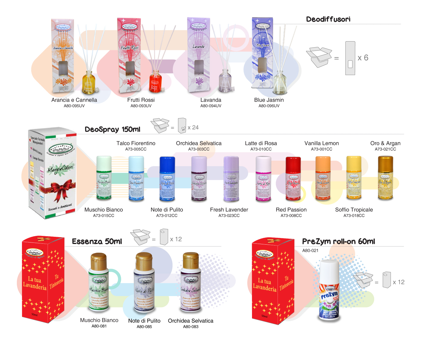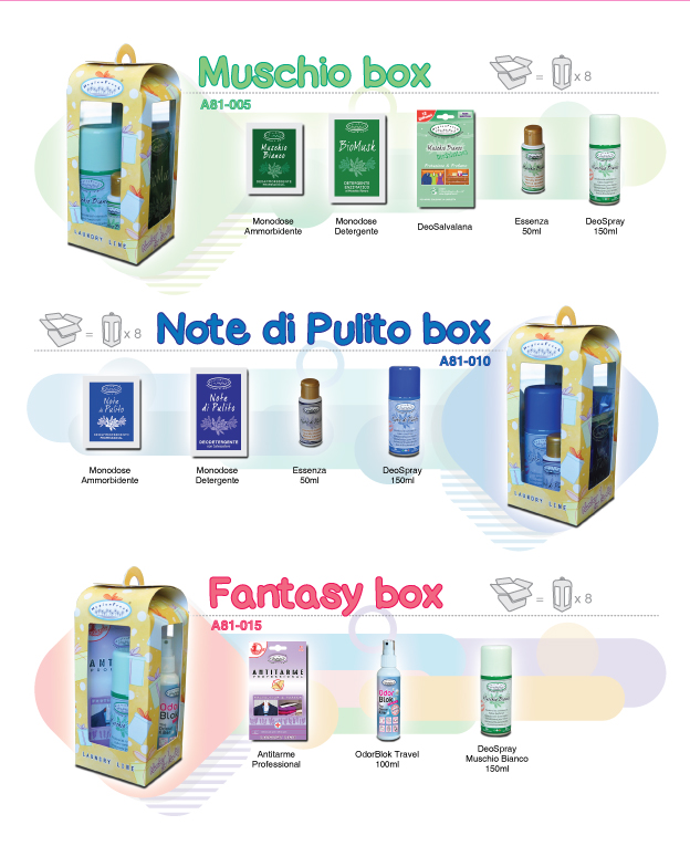 Puoi scegliere i tuoi preferiti da una vasta gamma di prodotti per la profumazione e la protezione di tessuti e ambienti o far provare Detergenti, Ammorbidenti e Additivi per il lavaggio regalando pratiche Confezioni Monodose!