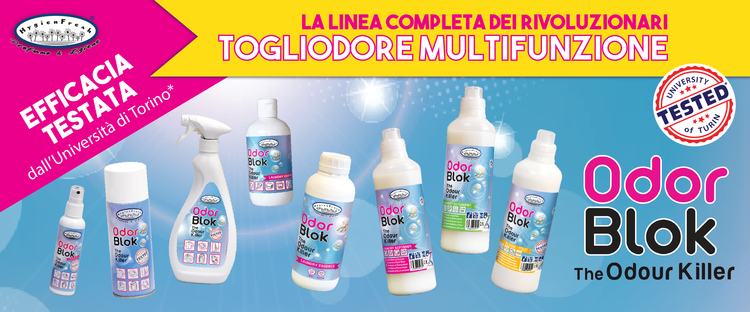 HygienFresh has developed ODORBLOK line of revolutionary Multifunctional Odour-removers, which eliminate odours and release a fresh and clean scent in the air and on fabrics, thanks to their special formula.