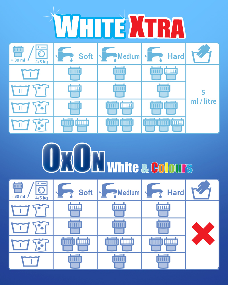 Add the suggested amount of White Xtra and Oxon in the detergent compartment of the washing machine and start the washing cycle. It is advisable to choose the standard programme for white garments at 40°-60° but these products are active already at 20°.