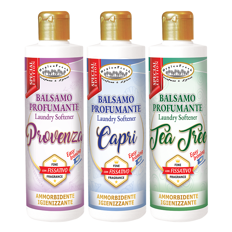 Hygienising softeners with fragrance fixative, which make ironing easier and leave garments soft and fluffy. Their formulas contain active molecules that fix the fragrance on fibres and gradually release it for a long time. They are available in 3 fragrances: