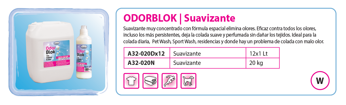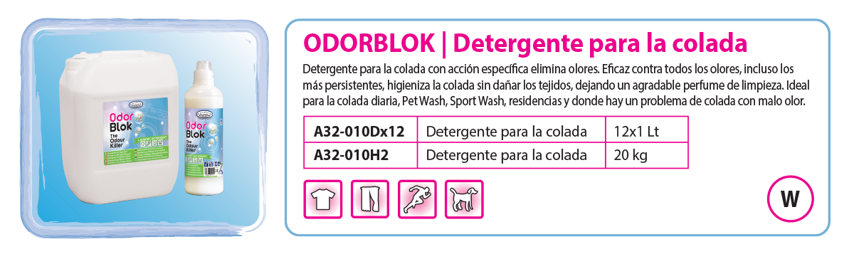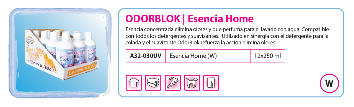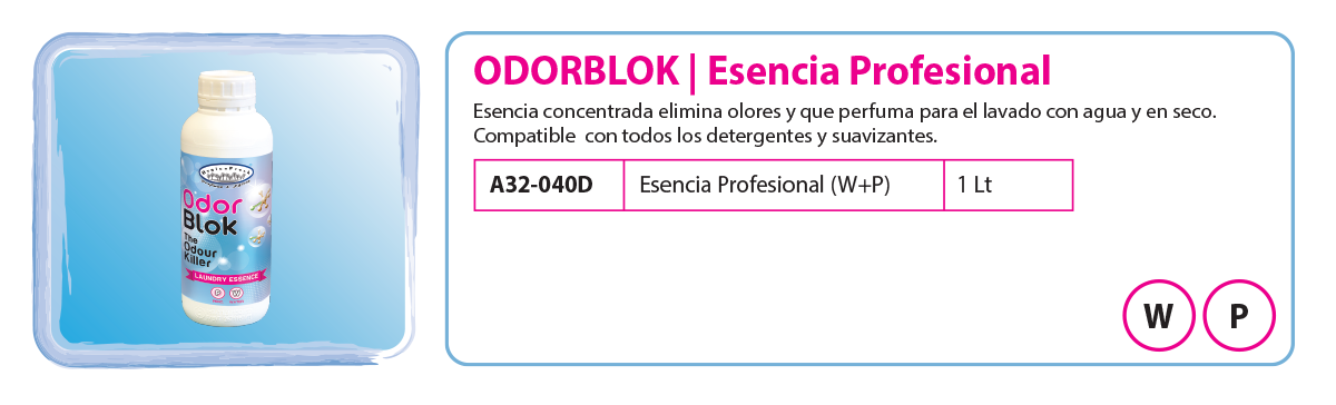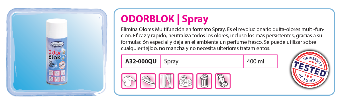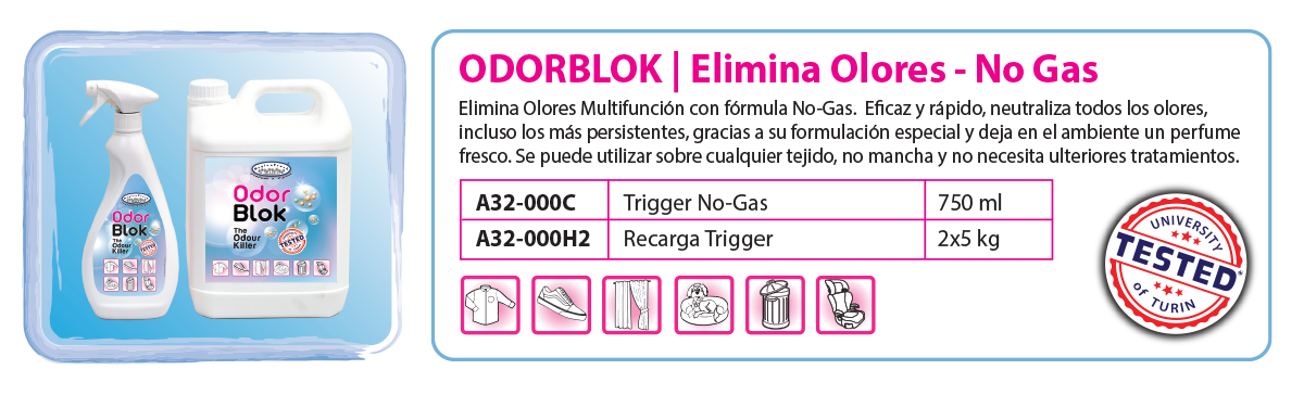 Toda la gama OdorBlok gracias a su fórmula especial, neutraliza los olores dejando en los ambientes y sobre los tejidos un perfume de limpio y fresco.