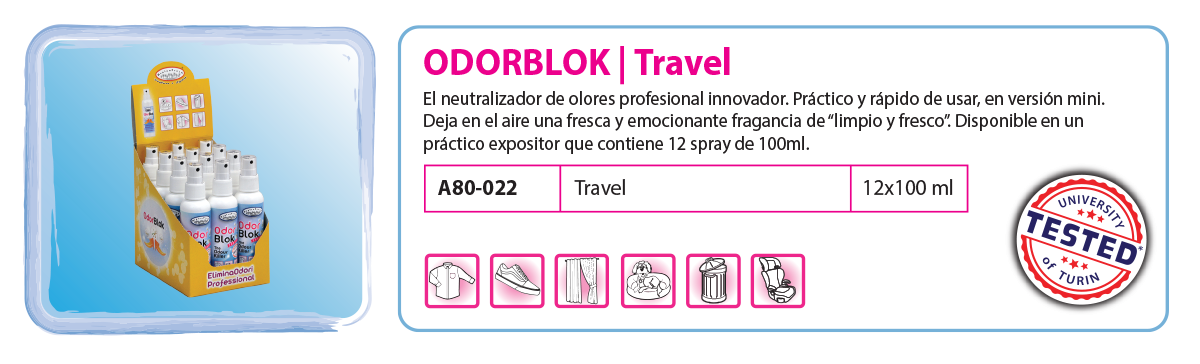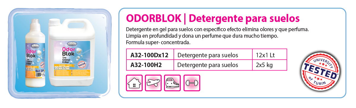 RESULTADOS GARANTIZADOS Después haber efectuado numerosos test, la Universidad de Turín ha certificado la calidad de los productos de la gama OdorBlok* garantizando sus resultados incluso en los retos más difíciles. * Válido por: Odorblok Elimina Olores 2x5kg-750ml-400ml, OdorBlok Travel 100ml y OdorBlok Suelos 2x5kg-1Lt |