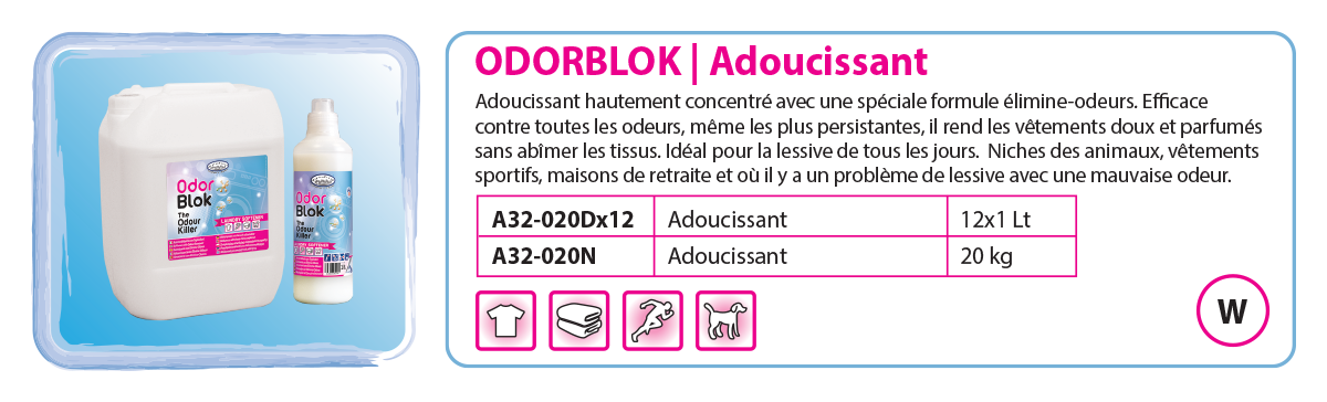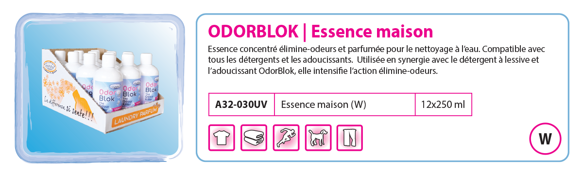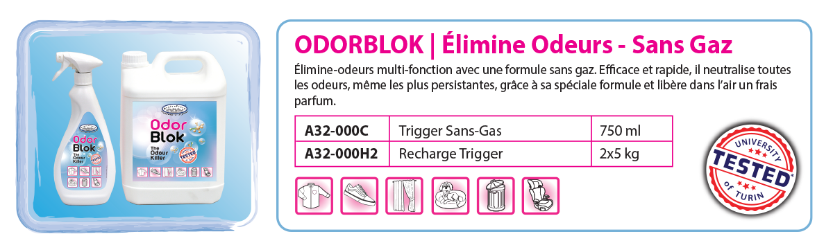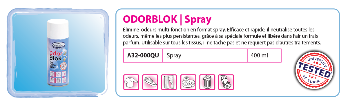 Toute la ligne OdorBlok grâce à sa spéciale formule, neutralise les odeurs en libérant dans l’air et sur les tissus un frais parfum de propreté.
