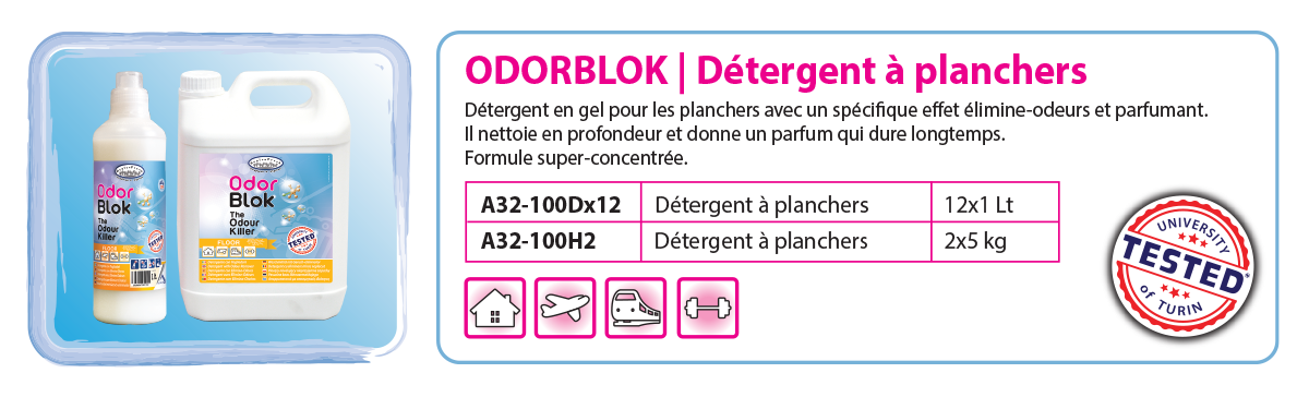 RÉSULTATS GARANTIS Après avoir effectué plusieurs tests, l’Université de Turin a certifiée la qualité des produits * Valide pour: Odorblok élimine odeurs 2x5kg-750ml-400ml, OdorBlok voyage 100ml et OdorBlok planchers 2x5kg-1Lt |